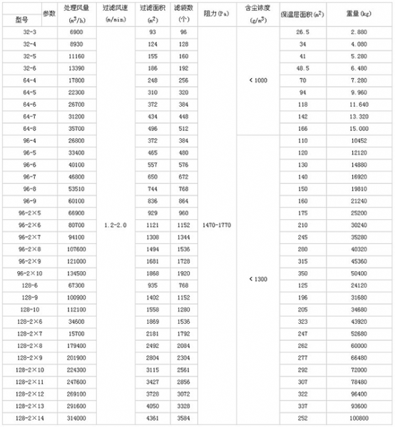 本系列產(chǎn)品共有33種規(guī)格,每室的袋有32、64、96、128袋四種,濾袋長度有2450mm和3060mm兩種,收塵效率可達99.9%以上,凈化后氣體的含塵濃度小于100mg/m3(標(biāo))本系列收塵器如用于寒冷地區(qū),當(dāng)室外采暖計算溫度≤-25℃時,要設(shè)熱裝置。